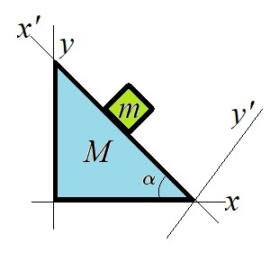 The coordinates of the block are given by \begin{align} x &= x' \cos \alpha + x_M \\ y &= x'\sin\alpha . \end{align} So, the constraint is $$\frac{y}{x-x_M}=\tan \alpha.$$ Then we have \begin{align} Q_y &= \frac{\lambda}{x-x_M}\\ Q_x &= -\frac{\lambda_y}{(x-x_M)^2}\\ Q_{x_M} &= \frac{\lambda_y}{(x-x_M)^2}. \end{align} Substitute these into the Lagrange's equations, we have \begin{align} m\ddot{x} &= -\frac{\lambda}{(x-x_M)^2}=-\frac{\lambda\tan\alpha}{x-x_M}\\ m\dot{y}-mg&=\frac{\lambda}{x-x_M}\\ M\ddot{x}_M &= \frac{\lambda y}{(x-x_M)^2}=\frac{\lambda\tan\alpha}{x-x_M}. \end{align} From these equations, we have the relation $$\ddot{x}_M=-\frac{m}{M}\ddot{x}.$$ From the constraint, we have $$\ddot{y} = \tan\alpha(\ddot{x}-\ddot{x}_M).$$ Substitute this back, $$\tan\alpha(\ddot{x}-\ddot{x}_M)-g=\frac{\lambda}{m(x-x_M)}$$ we obtain $$\lambda = m(x-x_M)[\tan\alpha(\ddot{x}-\ddot{x}_M)-g].$$ Substitute \(\lambda\) and the relation \(\ddot{x}_M=-m\ddot{x}/M\) back into the equations of motion, we have \begin{align} m\ddot{x} &=-m\tan\alpha\left[\tan\alpha\left(\ddot{x}-\left(-\frac{m}{M}\ddot{x}\right)\right)-g\right]\\ \ddot{x} &= \frac{Mg\sin\alpha\cos\alpha}{M+m\sin\alpha}\\ \ddot{x}_M &= -\frac{m}{M}\ddot{x} = -\frac{mg\sin\alpha\cos\alpha}{M+m\sin\alpha} \end{align}